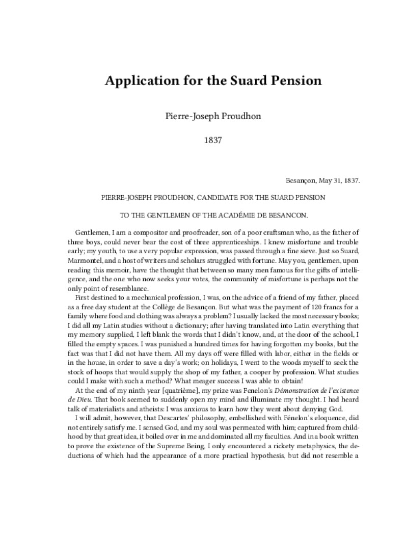 Zine Application for the Suard Pension Author: Pierre-Joseph ProudhonPublished: 1837Language: enCatalog: The Anarchist Library6 pages. Read online: html • pdf •imposed pdf • a4 pdf • epub • muse • tex Share: We mail all zines to incarcerated people for free.