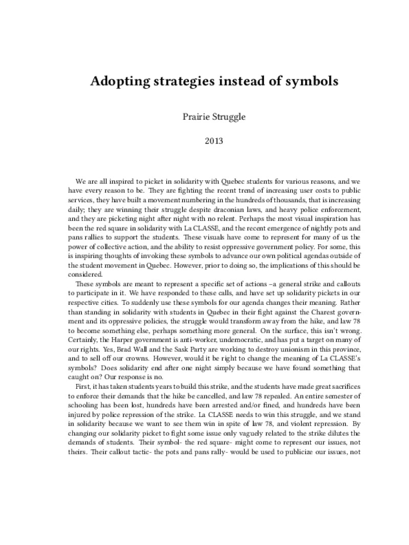 Zine Adopting strategies instead of symbols Author: Prairie StrugglePublished: 2013Language: enCatalog: The Anarchist Library3 pages. Read online: html • pdf •imposed pdf • a4 pdf • epub • muse • tex Share: We mail all zines to incarcerated people for free.
