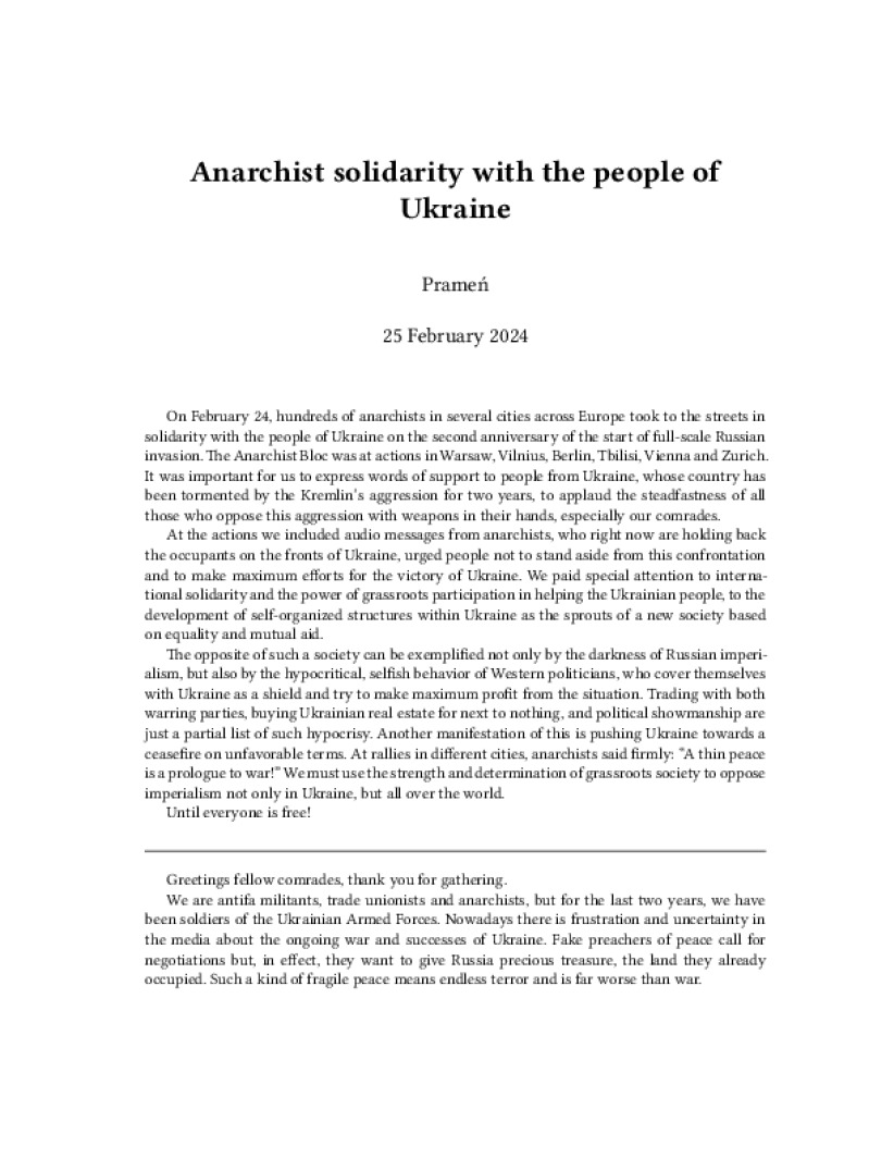 Zine Anarchist solidarity with the people of Ukraine Author: Prame?Published: 25 February 2024Language: enCatalog: The Anarchist Library3 pages. Read online: html • pdf •imposed pdf • a4 pdf • epub • muse • tex Share: We mail all zines to incarcerated people for free.