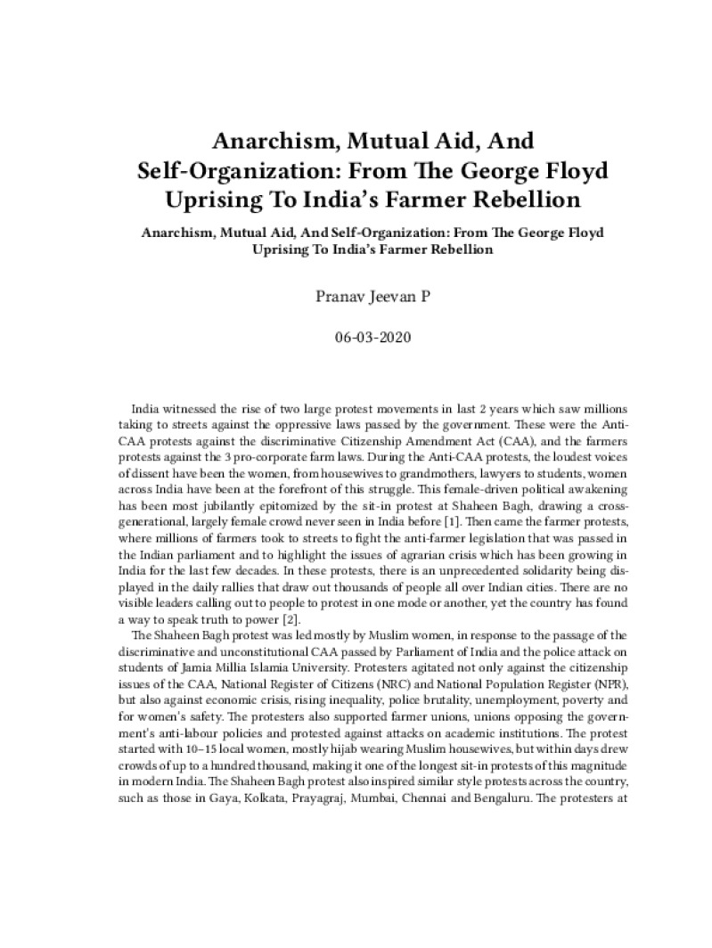 Zine Anarchism, Mutual Aid, And Self-Organization: From The George Floyd Uprising To India’s Farmer Rebellion Author: Pranav Jeevan PPublished: 06-03-2020Language: enCatalog: The Anarchist Library8 pages. Read online: html • pdf •imposed pdf • a4 pdf • epub • muse • tex Share: We mail all zines to incarcerated people for free.