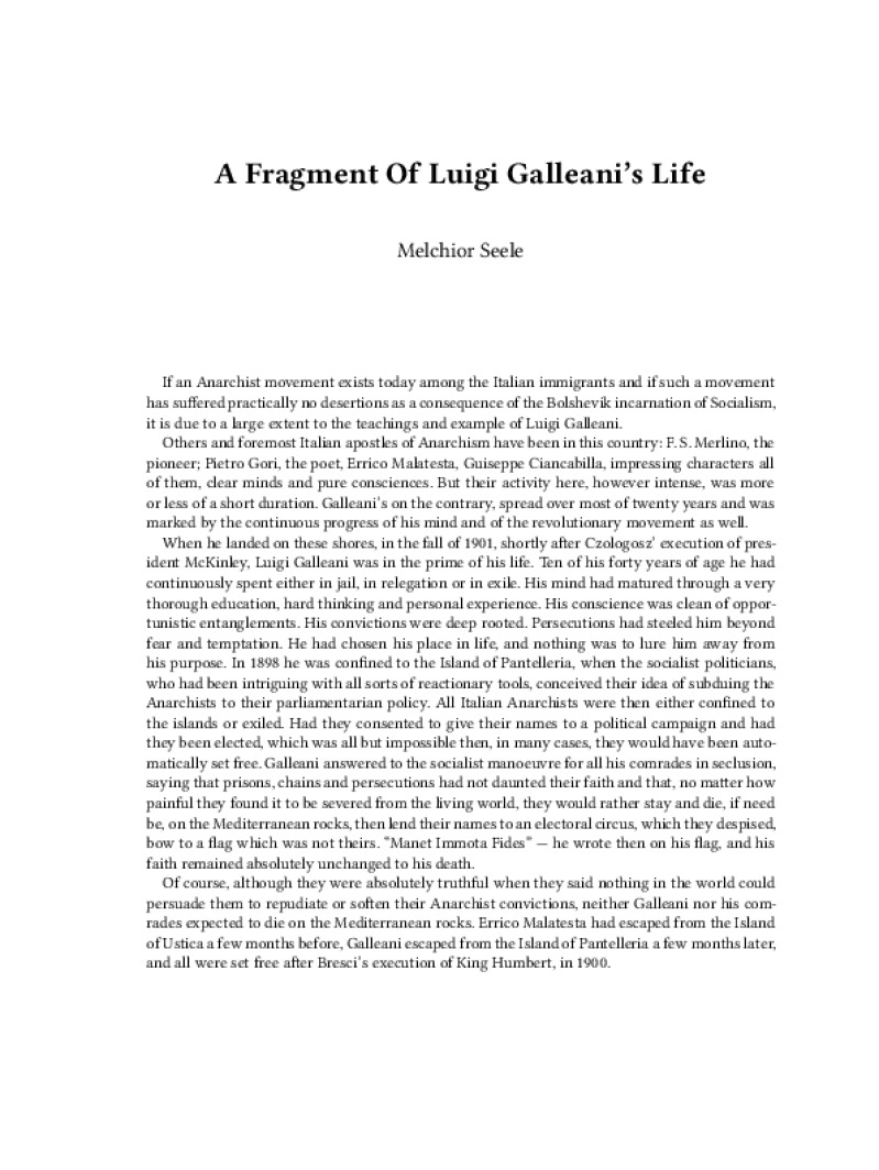 Zine A Fragment Of Luigi Galleani’s Life Author: Melchior SeeleLanguage: enCatalog: The Anarchist Library6 pages. Read online: html • pdf •imposed pdf • a4 pdf • epub • muse • tex Share: We mail all zines to incarcerated people for free.