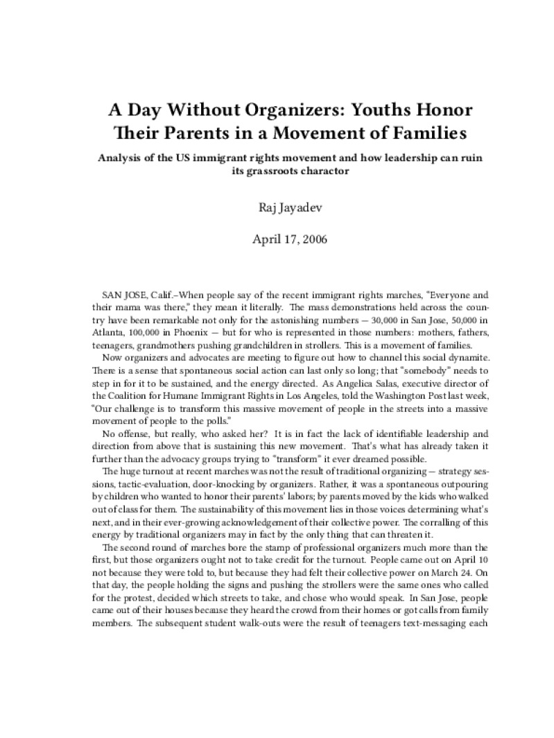 Zine A Day Without Organizers: Youths Honor Their Parents in a Movement of Families Author: Raj JayadevPublished: April 17, 2006Language: enCatalog: The Anarchist Library3 pages. Read online: html • pdf •imposed pdf • a4 pdf • epub • muse • tex Share: We mail all zines to incarcerated people for free.