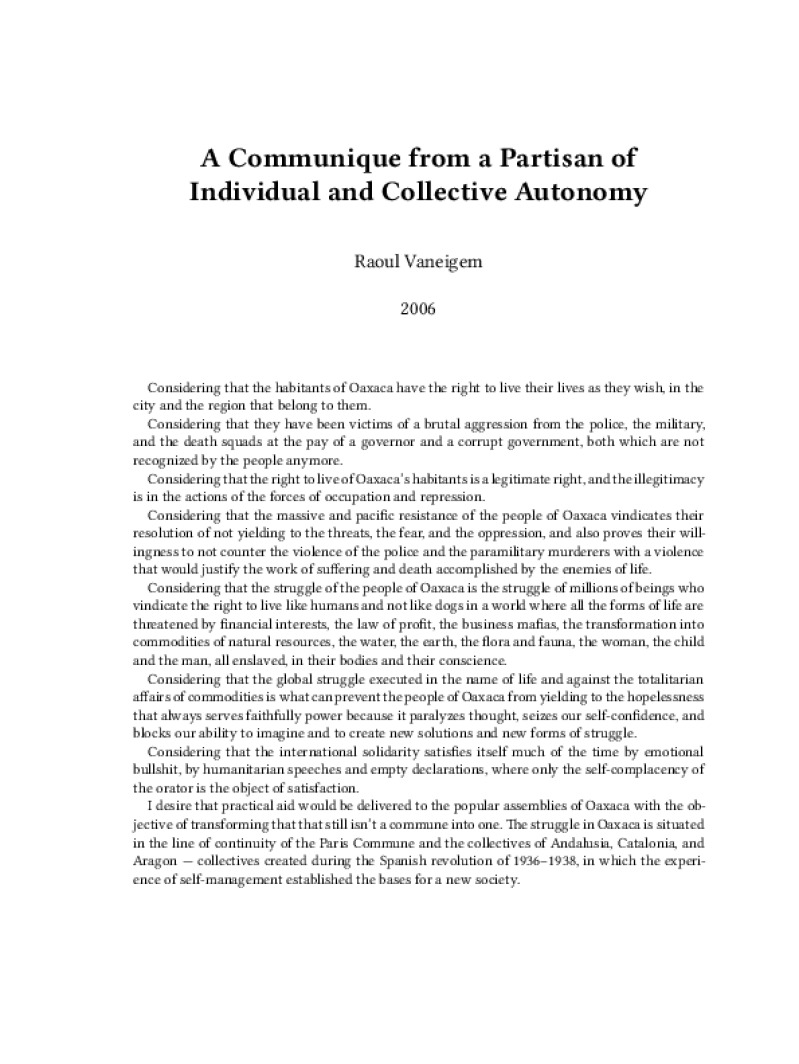 Zine A Communique from a Partisan of Individual and Collective Autonomy Author: Raoul VaneigemPublished: 2006Language: enCatalog: The Anarchist Library3 pages. Read online: html • pdf •imposed pdf • a4 pdf • epub • muse • tex Share: We mail all zines to incarcerated people for free.