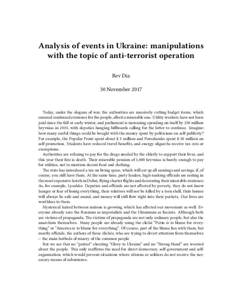 Zine Analysis of events in Ukraine: manipulations with the topic of anti-terrorist operation Author: Rev DiaPublished: 30 November 2017Language: enCatalog: The Anarchist Library3 pages. Read online: html • pdf •imposed pdf • a4 pdf • epub • muse • tex Share: We mail all zines to incarcerated people for free.