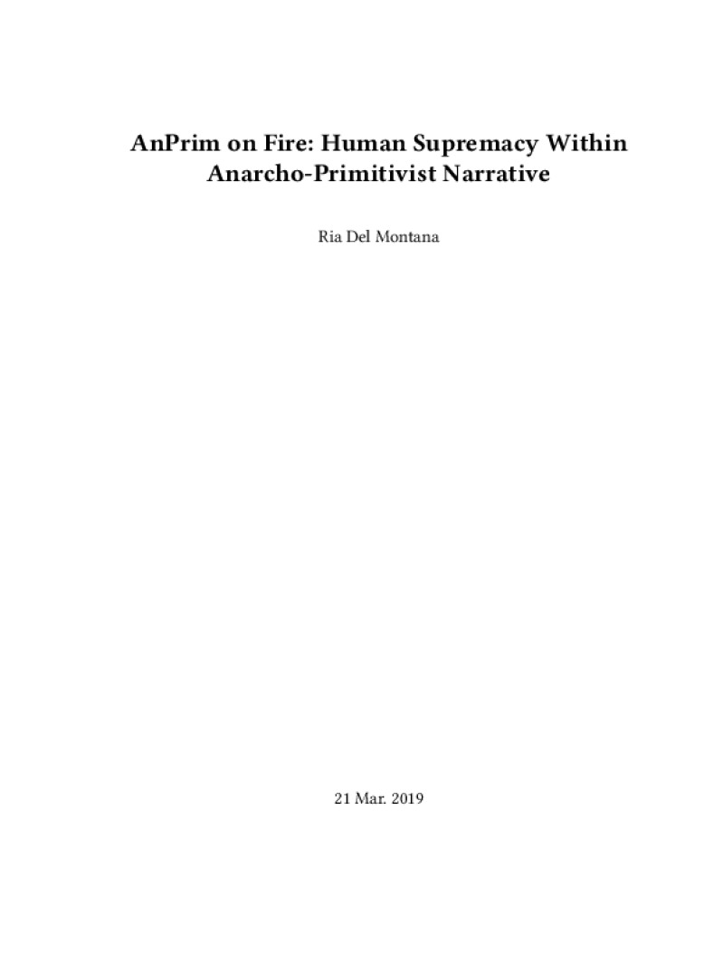Zine AnPrim on Fire: Human Supremacy Within Anarcho-Primitivist Narrative Author: Ria Del MontanaPublished: 21 Mar. 2019Language: enCatalog: The Anarchist Library12 pages. Read online: html • pdf •imposed pdf • a4 pdf • epub • muse • tex Share: We mail all zines to incarcerated people for free.