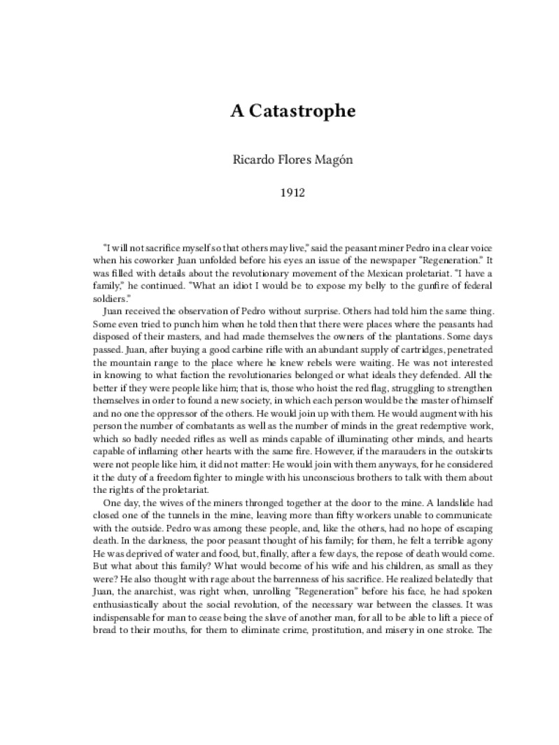 Zine A Catastrophe Author: Ricardo Flores MagónPublished: 1912Language: enCatalog: The Anarchist Library4 pages. Read online: html • pdf •imposed pdf • a4 pdf • epub • muse • tex Share: We mail all zines to incarcerated people for free.