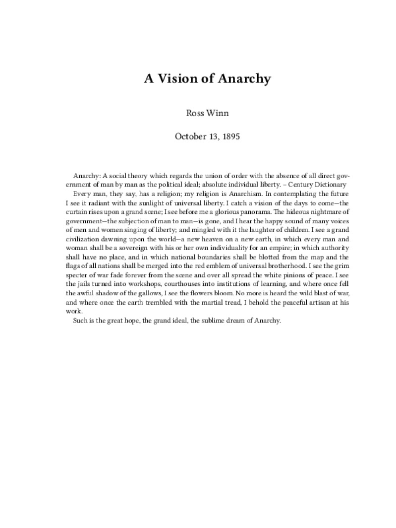 Zine A Vision of Anarchy Author: Ross WinnPublished: October 13, 1895Language: enCatalog: The Anarchist Library2 pages. Read online: html • pdf •imposed pdf • a4 pdf • epub • muse • tex Share: We mail all zines to incarcerated people for free.