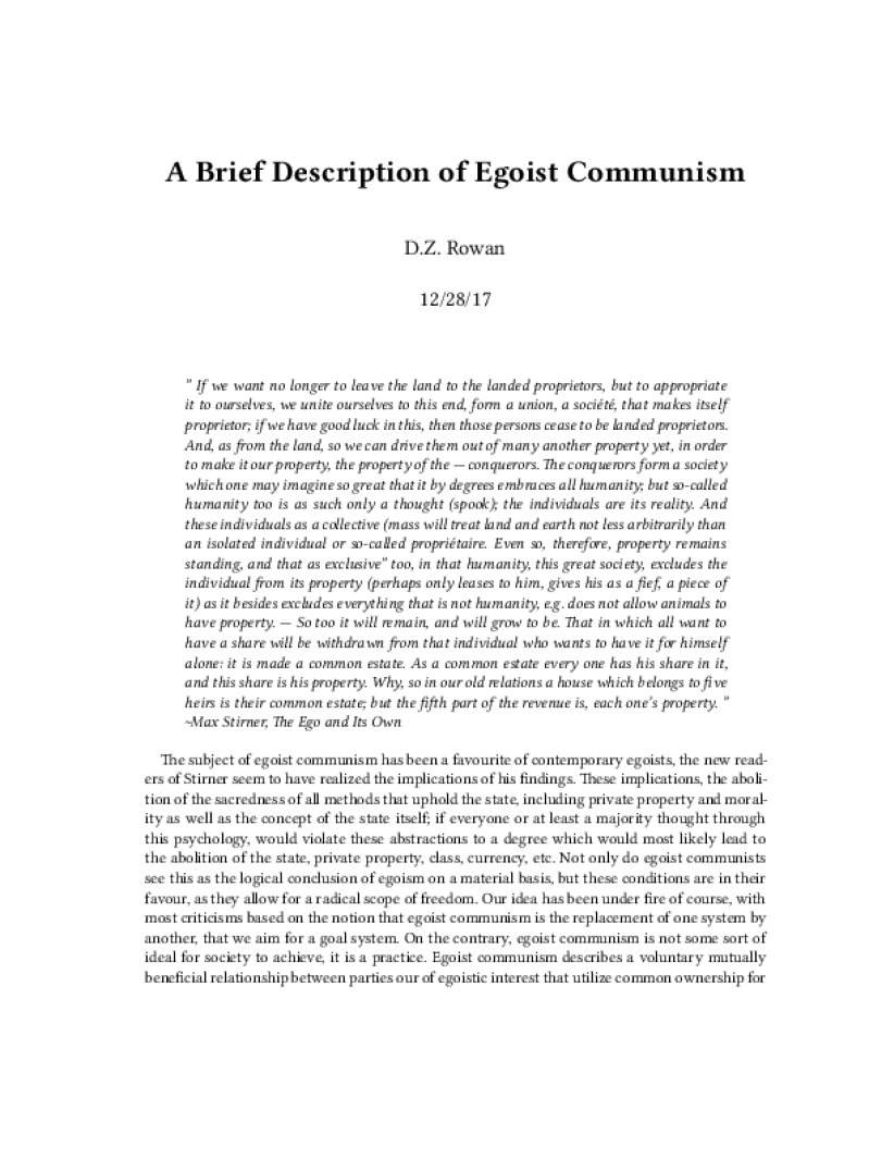Zine A Brief Description of Egoist Communism Author: D.Z. RowanPublished: 12/28/17Language: enCatalog: The Anarchist Library7 pages. Read online: html • pdf •imposed pdf • a4 pdf • epub • muse • tex Share: We mail all zines to incarcerated people for free.