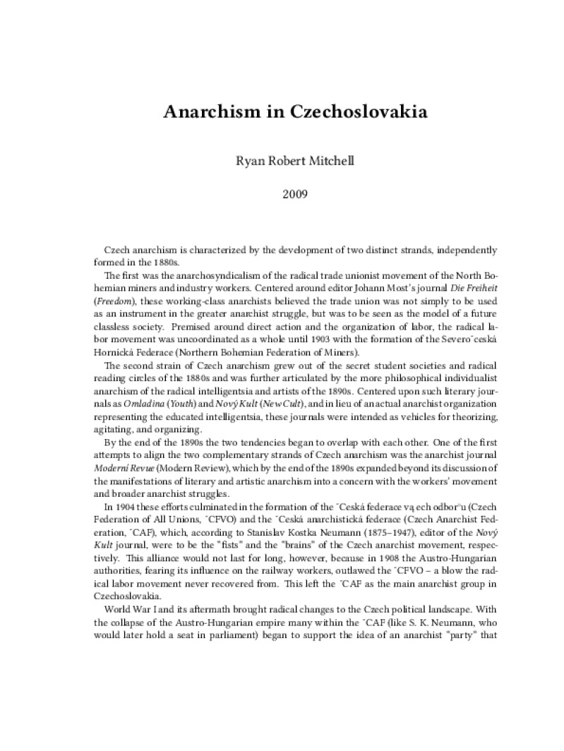 Zine Anarchism in Czechoslovakia Author: Ryan Robert MitchellPublished: 2009Language: enCatalog: The Anarchist Library3 pages. Read online: html • pdf •imposed pdf • a4 pdf • epub • muse • tex Share: We mail all zines to incarcerated people for free.