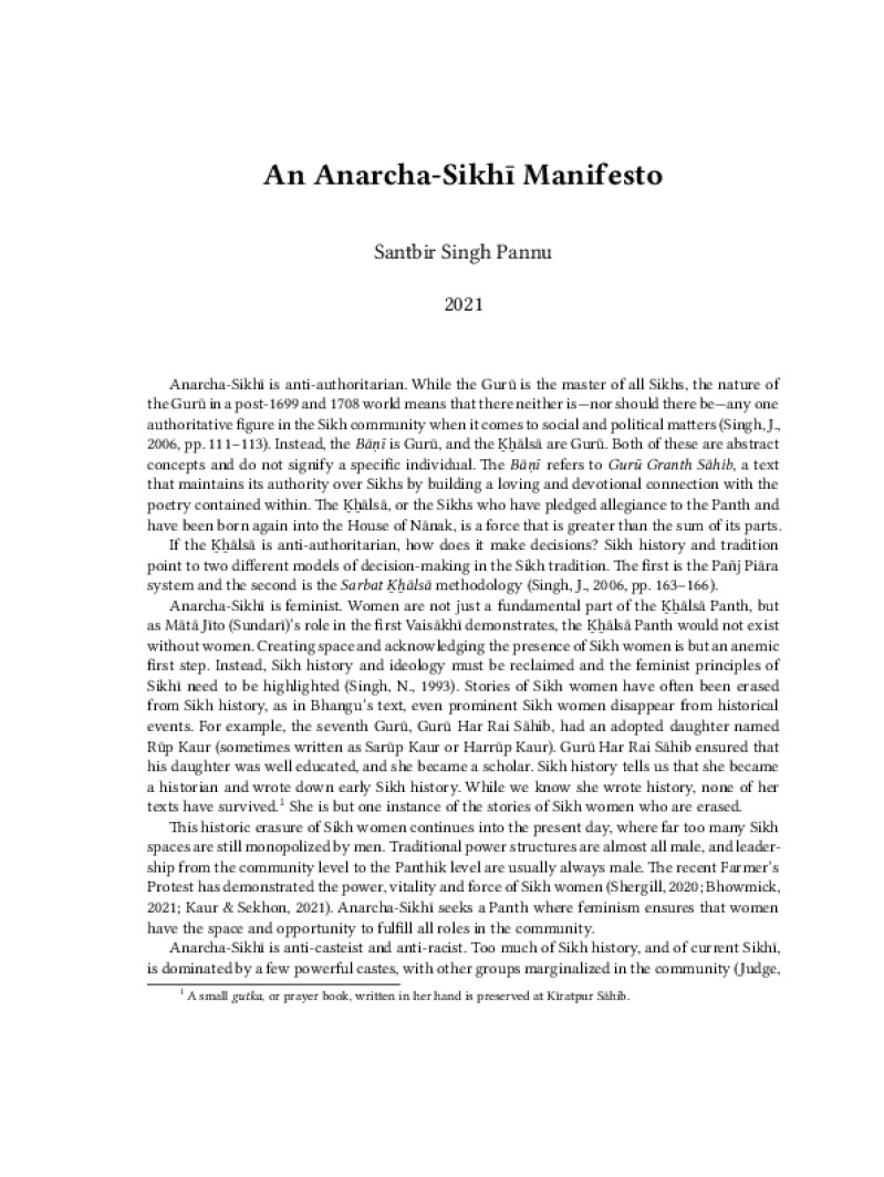 Zine An Anarcha-Sikh? Manifesto Author: Santbir Singh PannuPublished: 2021Language: enCatalog: The Anarchist Library4 pages. Read online: html • pdf •imposed pdf • a4 pdf • epub • muse • tex Share: We mail all zines to incarcerated people for free.
