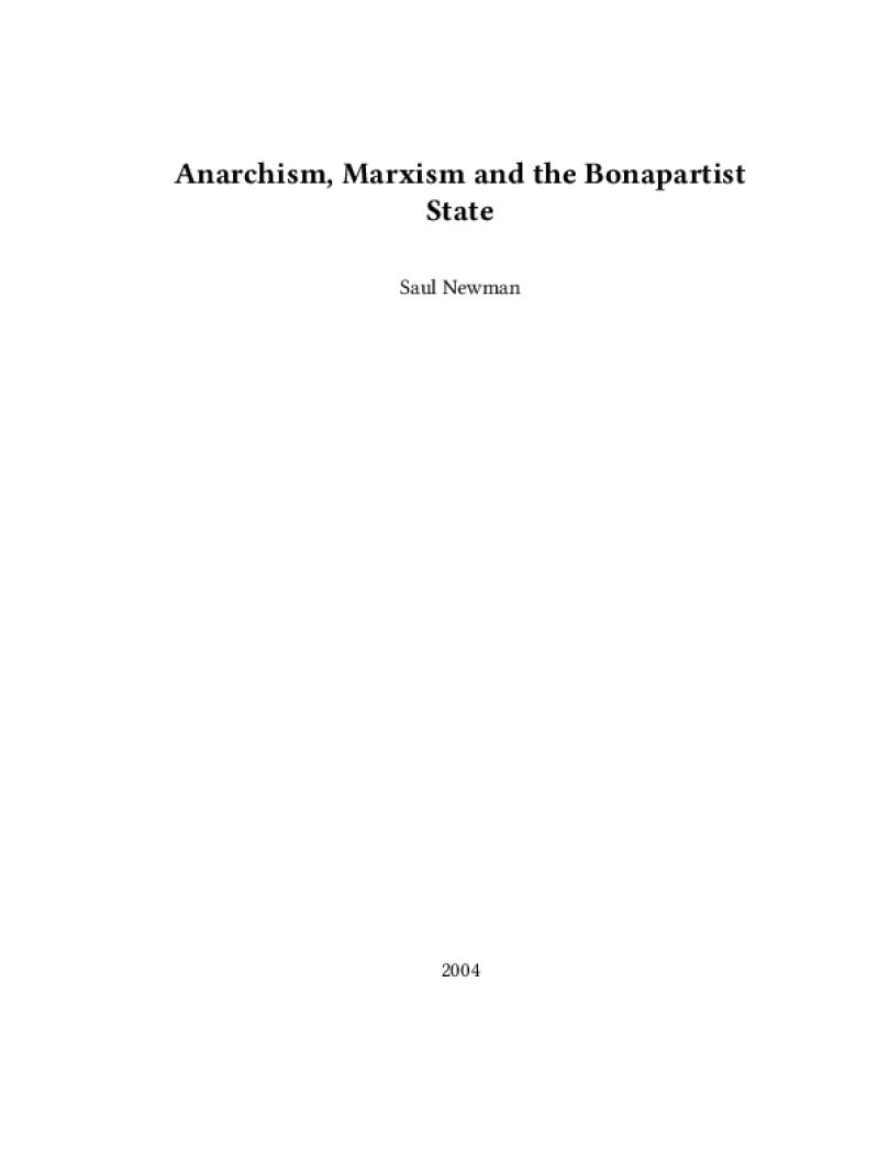 Zine Anarchism, Marxism and the Bonapartist State Author: Saul NewmanPublished: 2004Language: enCatalog: The Anarchist Library23 pages. Read online: html • pdf •imposed pdf • a4 pdf • epub • muse • tex Share: We mail all zines to incarcerated people for free.
