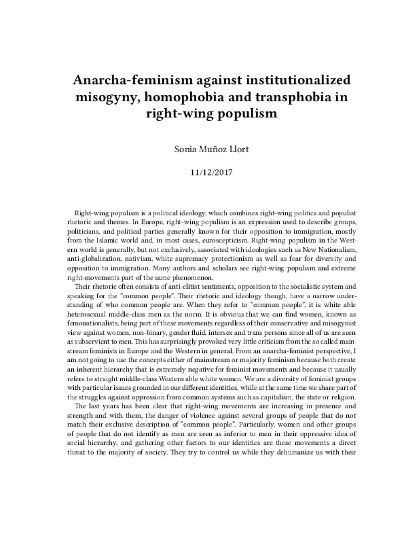 Zine Anarcha-feminism against institutionalized misogyny, homophobia and transphobia in right-wing populism Author: Sonia Muņoz LlortPublished: 11/12/2017Language: enCatalog: The Anarchist Library5 pages. Read online: html • pdf •imposed pdf • a4 pdf • epub • muse • tex Share: We mail all zines to incarcerated people for free.