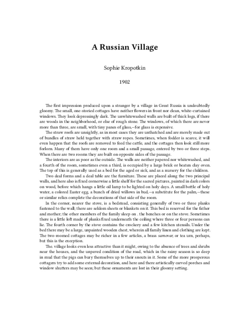 Zine A Russian Village Author: Sophie KropotkinPublished: 1902Language: enCatalog: The Anarchist Library5 pages. Read online: html • pdf •imposed pdf • a4 pdf • epub • muse • tex Share: We mail all zines to incarcerated people for free.