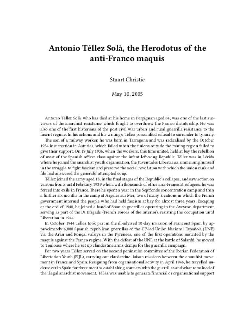 Zine Antonio Téllez Solà, the Herodotus of the anti-Franco maquis Author: Stuart ChristiePublished: May 10, 2005Language: enCatalog: The Anarchist Library3 pages. Read online: html • pdf •imposed pdf • a4 pdf • epub • muse • tex Share: We mail all zines to incarcerated people for free.