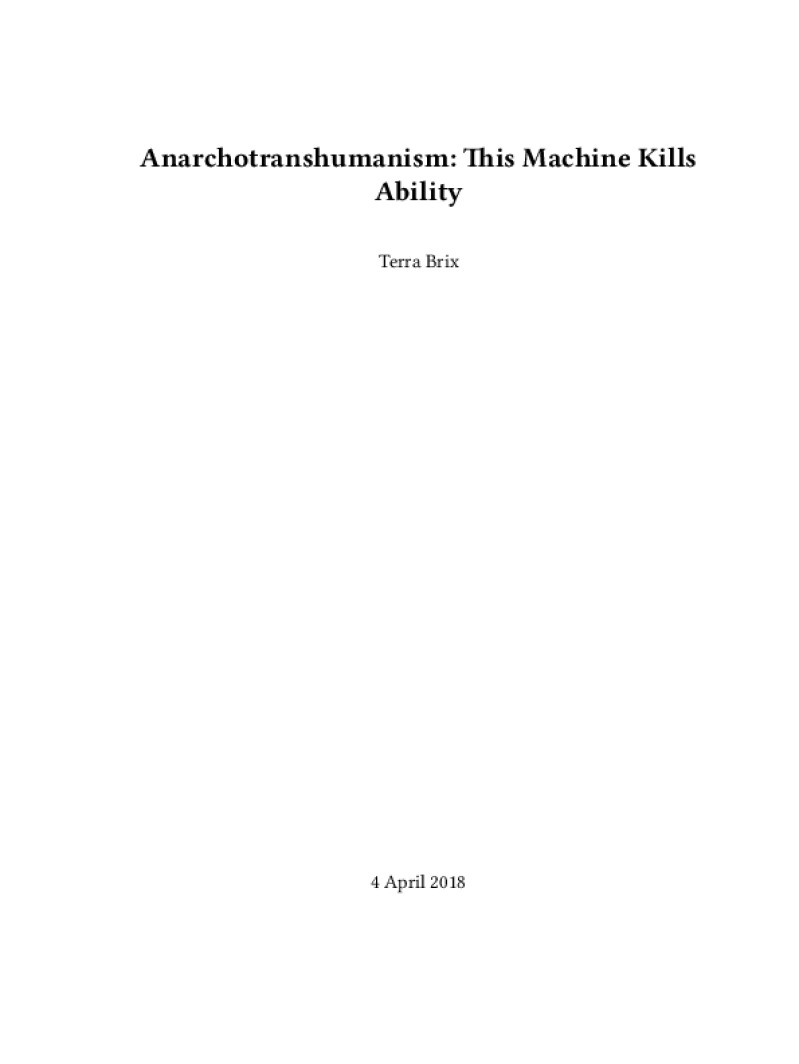 Zine Anarchotranshumanism: This Machine Kills Ability Author: Terra BrixPublished: 4 April 2018Language: enCatalog: The Anarchist Library14 pages. Read online: html • pdf •imposed pdf • a4 pdf • epub • muse • tex Share: We mail all zines to incarcerated people for free.