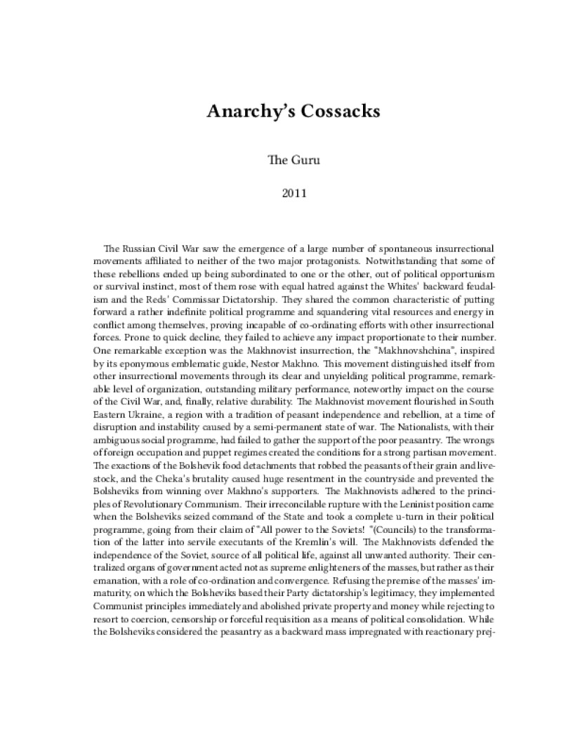 Zine Anarchy’s Cossacks Author: The GuruPublished: 2011Language: enCatalog: The Anarchist Library9 pages. Read online: html • pdf •imposed pdf • a4 pdf • epub • muse • tex Share: We mail all zines to incarcerated people for free.