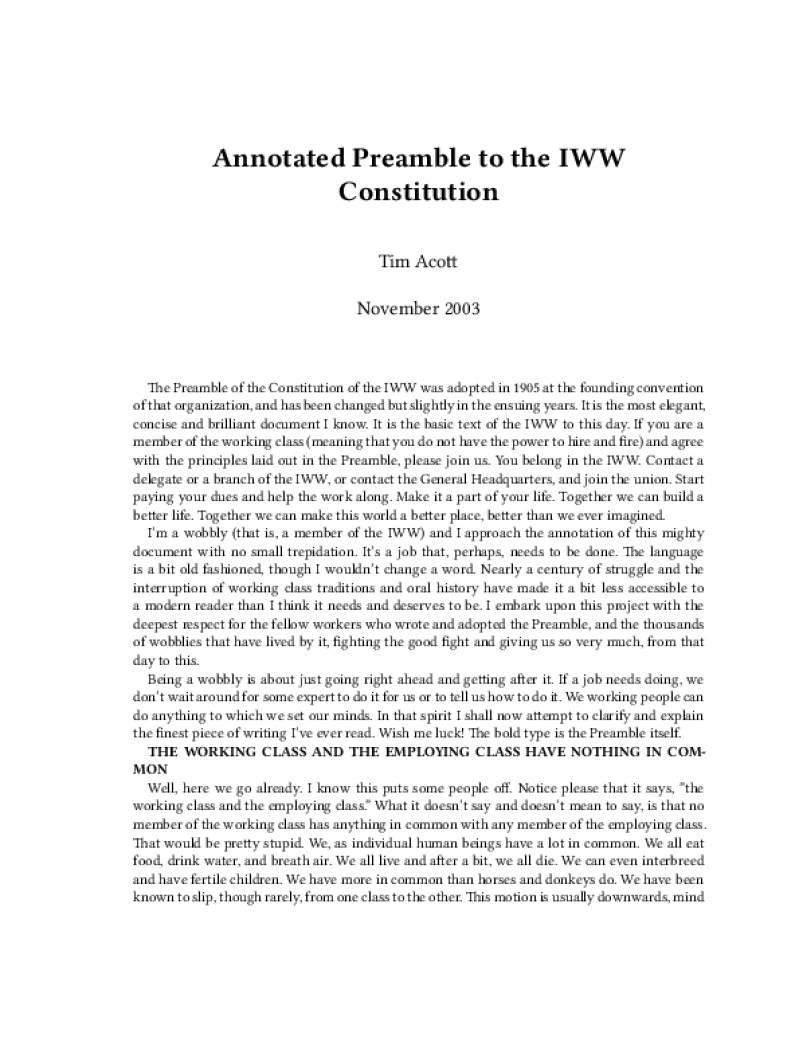 Zine Annotated Preamble to the IWW Constitution Author: Tim AcottPublished: November 2003Language: enCatalog: The Anarchist Library5 pages. Read online: html • pdf •imposed pdf • a4 pdf • epub • muse • tex Share: We mail all zines to incarcerated people for free.