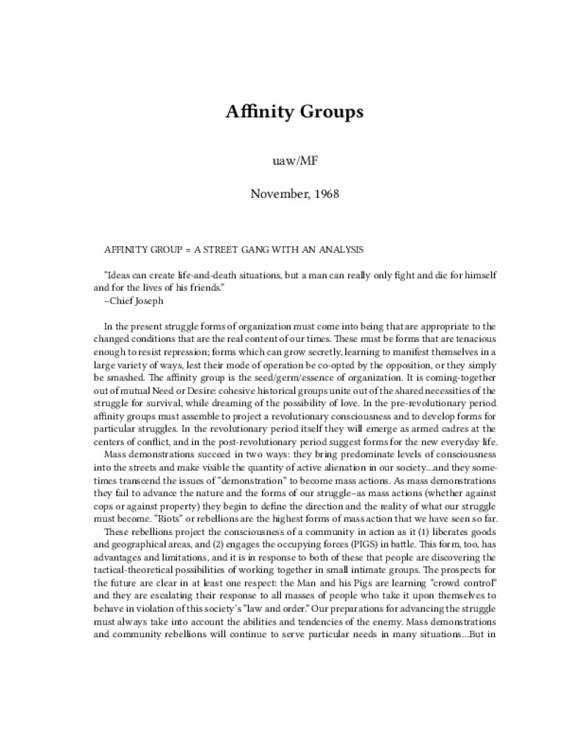 Zine Affinity Groups Author: uaw/MFPublished: November, 1968Language: enCatalog: The Anarchist Library3 pages. Read online: html • pdf •imposed pdf • a4 pdf • epub • muse • tex Share: We mail all zines to incarcerated people for free.