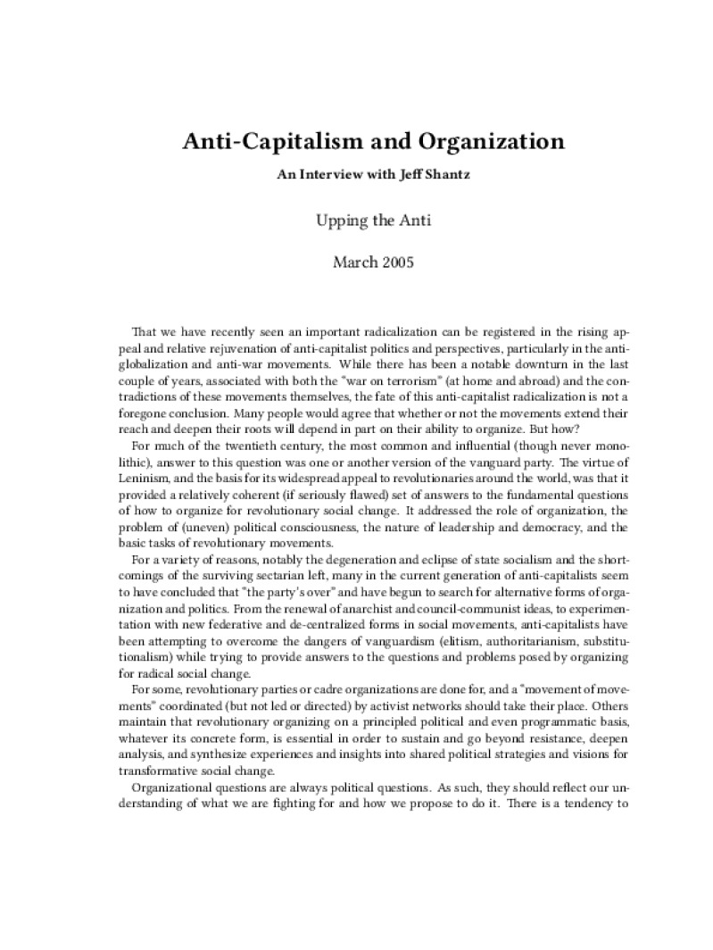 Zine Anti-Capitalism and Organization Author: Upping the AntiPublished: March 2005Language: enCatalog: The Anarchist Library6 pages. Read online: html • pdf •imposed pdf • a4 pdf • epub • muse • tex Share: We mail all zines to incarcerated people for free.