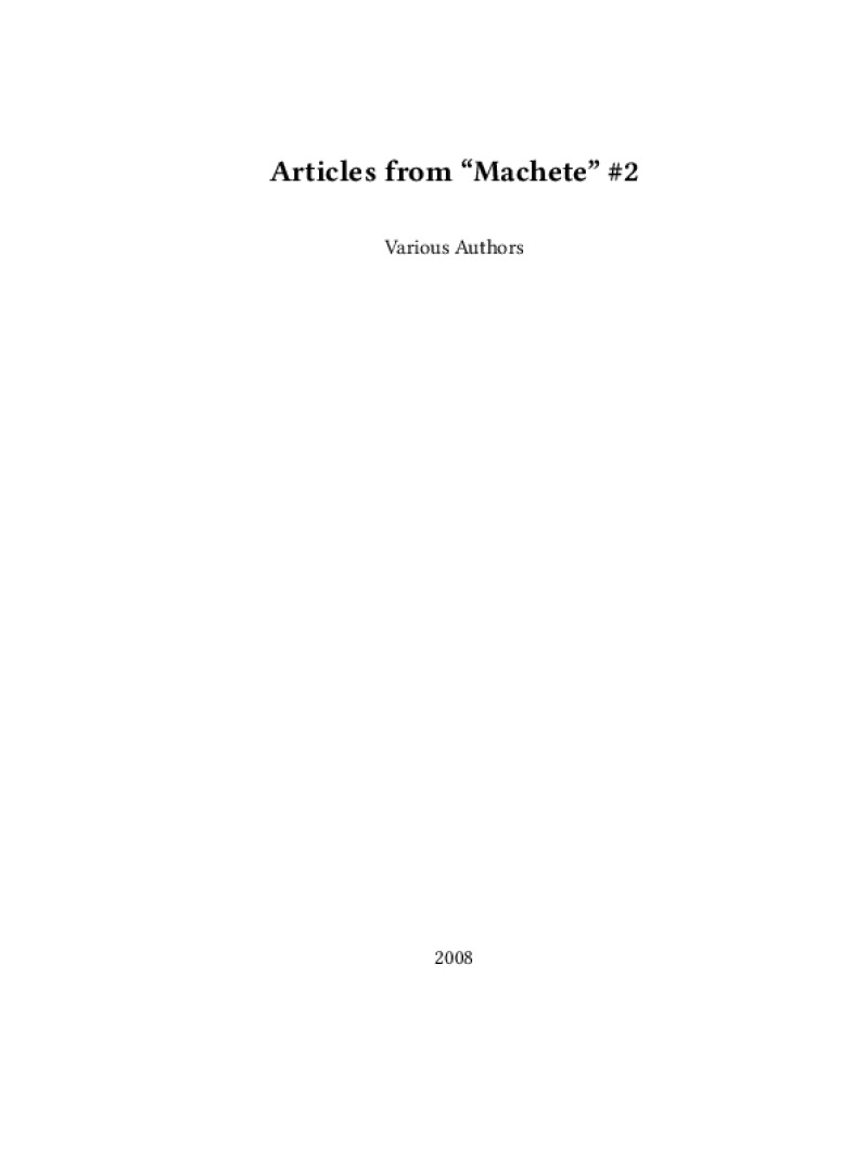 Zine Articles from “Machete” #2 Author: Various AuthorsPublished: 2008Language: enCatalog: The Anarchist Library20 pages. Read online: html • pdf •imposed pdf • a4 pdf • epub • muse • tex Share: We mail all zines to incarcerated people for free.