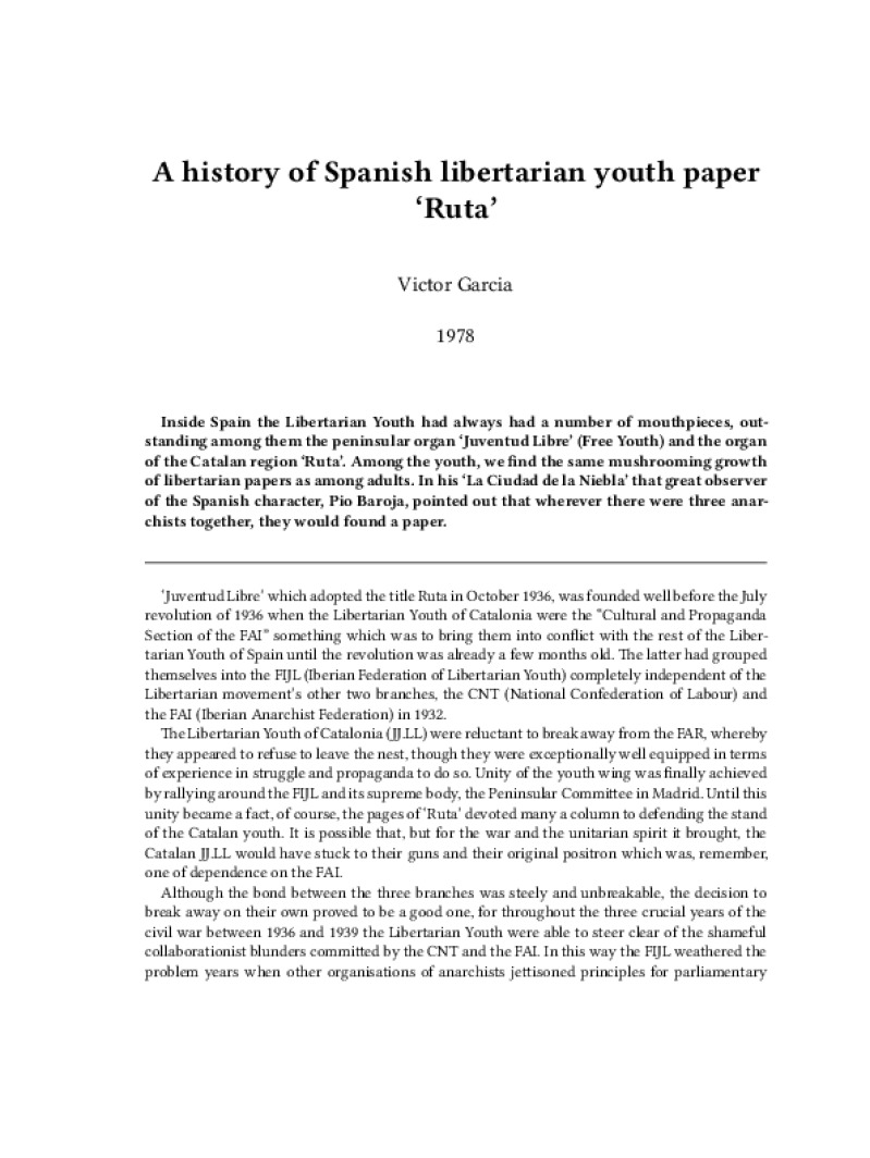Zine A history of Spanish libertarian youth paper ‘Ruta’ Author: Victor GarciaPublished: 1978Language: enCatalog: The Anarchist Library7 pages. Read online: html • pdf •imposed pdf • a4 pdf • epub • muse • tex Share: We mail all zines to incarcerated people for free.