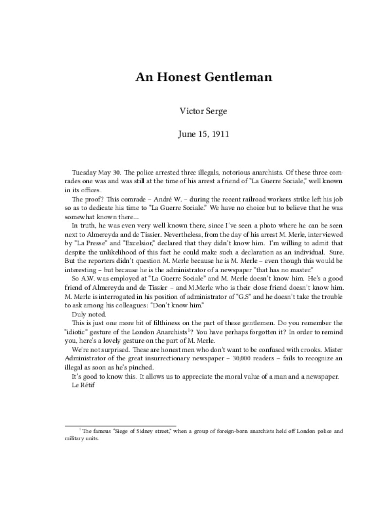 Zine An Honest Gentleman Author: Victor SergePublished: June 15, 1911Language: enCatalog: The Anarchist Library2 pages. Read online: html • pdf •imposed pdf • a4 pdf • epub • muse • tex Share: We mail all zines to incarcerated people for free.