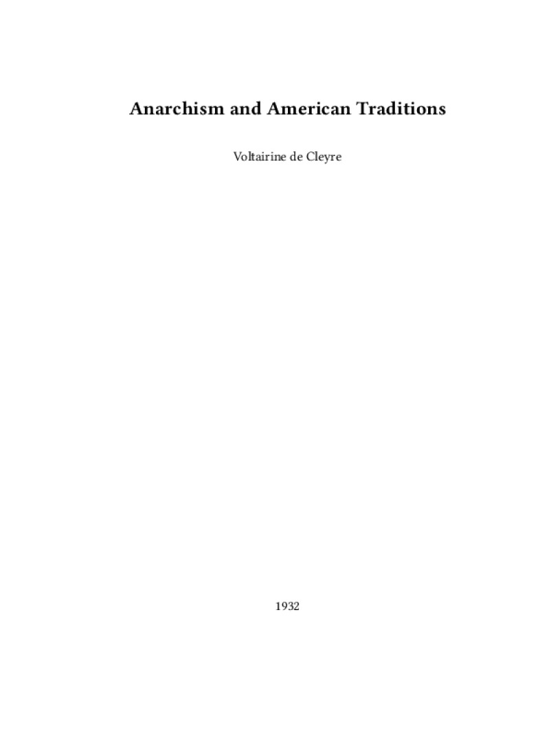 Zine Anarchism and American Traditions Author: Voltairine de CleyrePublished: 1932Language: enCatalog: The Anarchist Library14 pages. Read online: html • pdf •imposed pdf • a4 pdf • epub • muse • tex Share: We mail all zines to incarcerated people for free.