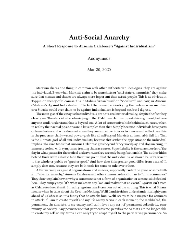 Zine Anti-Social Anarchy Author: AnonymousPublished: Mar 20, 2020Language: enCatalog: The Anarchist Library3 pages. Read online: html • pdf •imposed pdf • a4 pdf • epub • muse • tex Share: We mail all zines to incarcerated people for free.