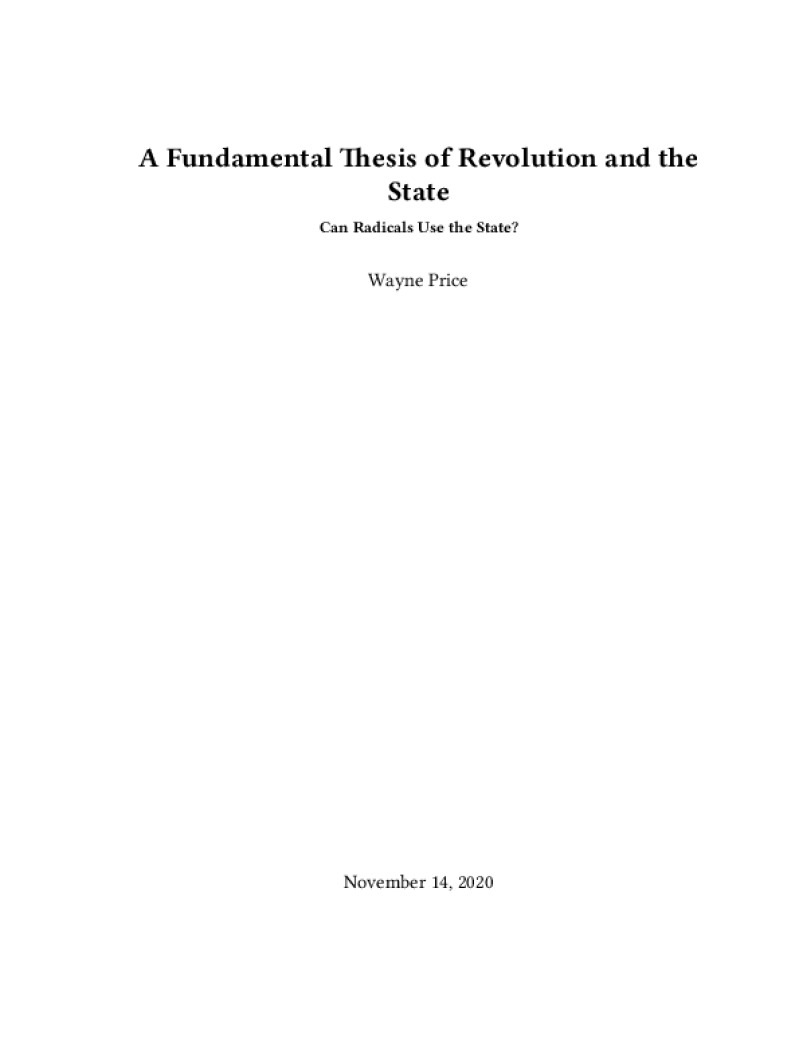 Zine A Fundamental Thesis of Revolution and the State Author: Wayne PricePublished: November 14, 2020Language: enCatalog: The Anarchist Library10 pages. Read online: html • pdf •imposed pdf • a4 pdf • epub • muse • tex Share: We mail all zines to incarcerated people for free.