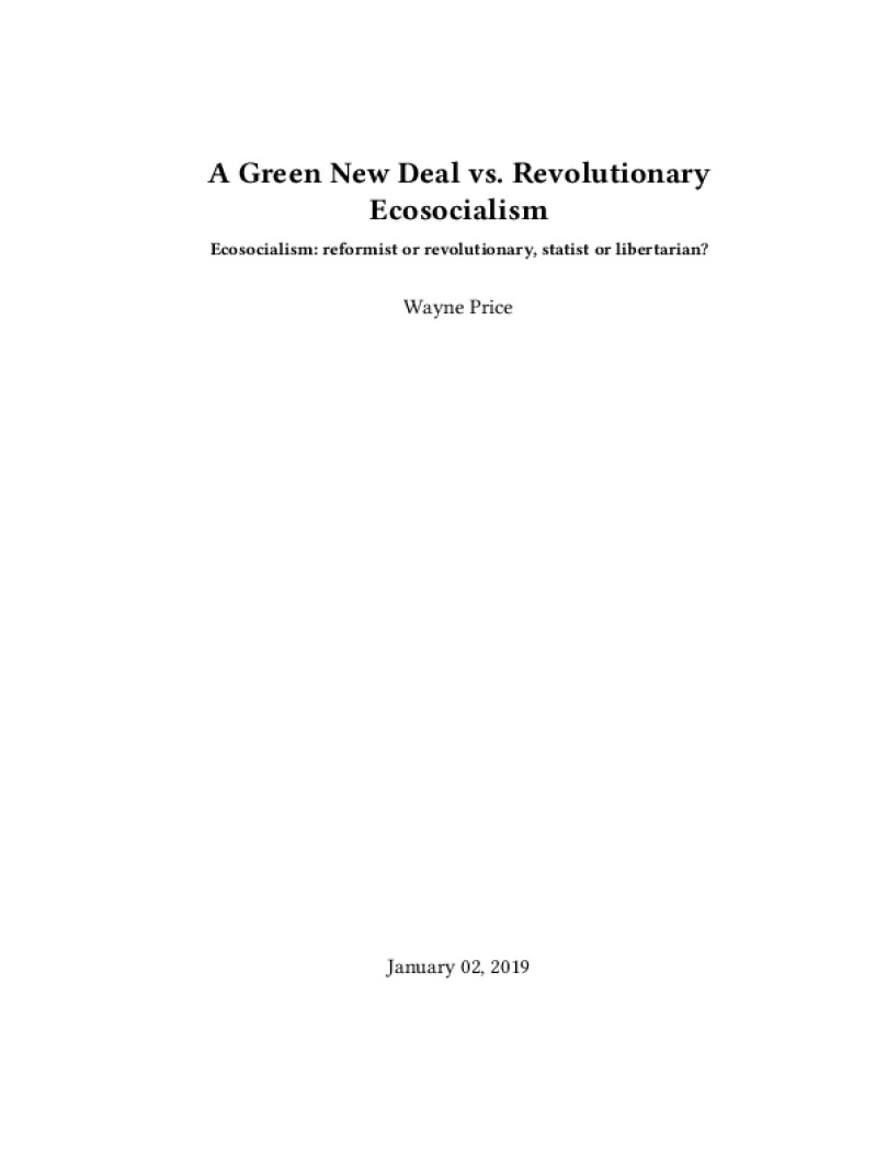 Zine A Green New Deal vs. Revolutionary Ecosocialism Author: Wayne PricePublished: January 02, 2019Language: enCatalog: The Anarchist Library11 pages. Read online: html • pdf •imposed pdf • a4 pdf • epub • muse • tex Share: We mail all zines to incarcerated people for free.