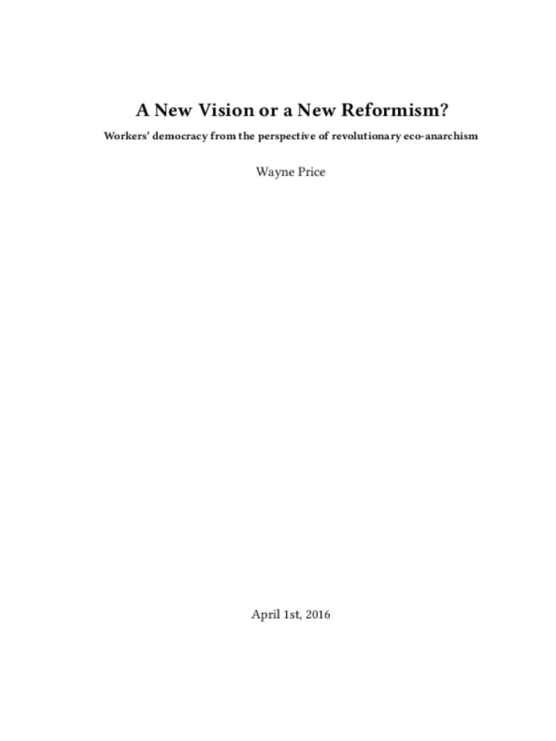 Zine A New Vision or a New Reformism? Author: Wayne PricePublished: April 1st, 2016Language: enCatalog: The Anarchist Library8 pages. Read online: html • pdf •imposed pdf • a4 pdf • epub • muse • tex Share: We mail all zines to incarcerated people for free.