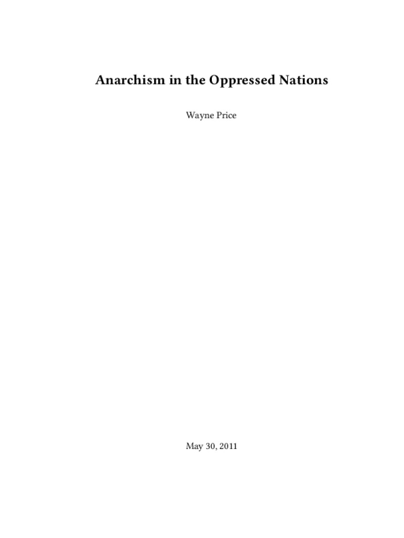 Zine Anarchism in the Oppressed Nations Author: Wayne PricePublished: May 30, 2011Language: enCatalog: The Anarchist Library7 pages. Read online: html • pdf •imposed pdf • a4 pdf • epub • muse • tex Share: We mail all zines to incarcerated people for free.