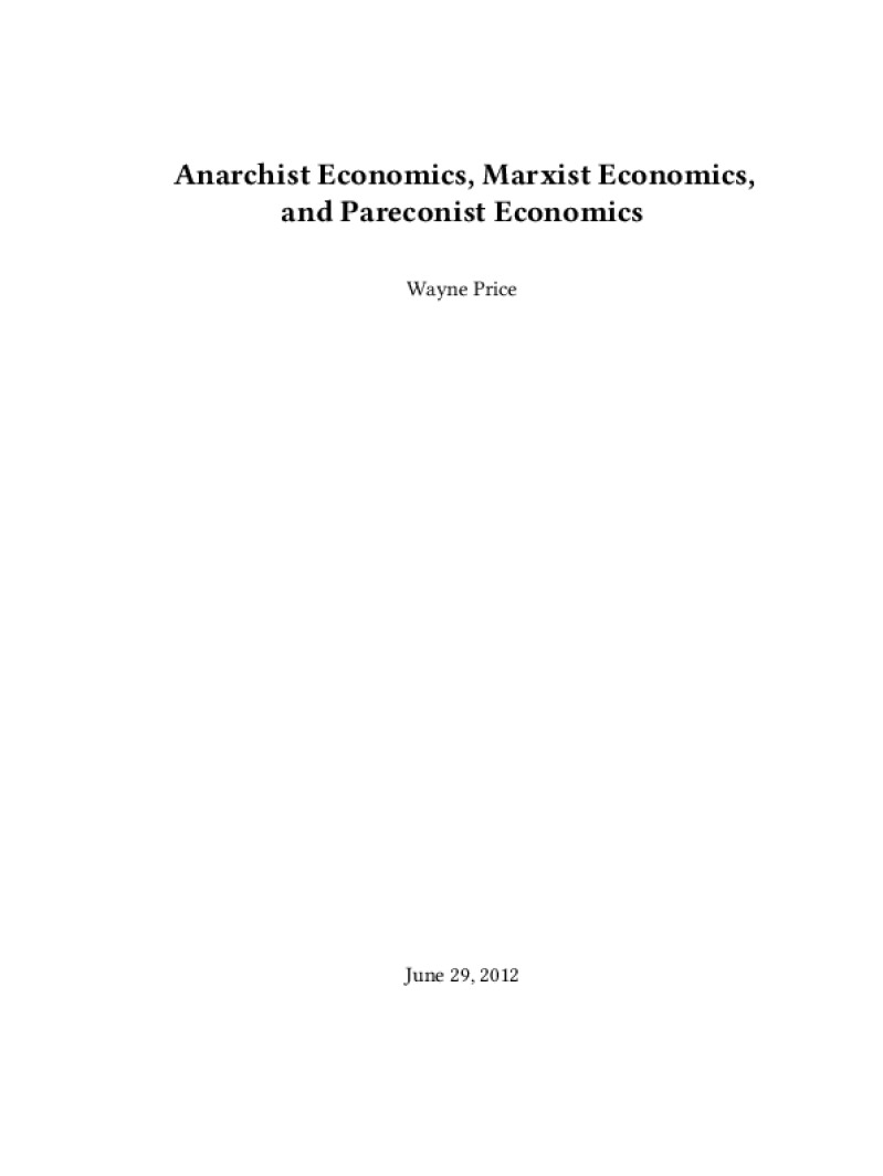 Zine Anarchist Economics, Marxist Economics, and Pareconist Economics Author: Wayne PricePublished: June 29, 2012Language: enCatalog: The Anarchist Library9 pages. Read online: html • pdf •imposed pdf • a4 pdf • epub • muse • tex Share: We mail all zines to incarcerated people for free.