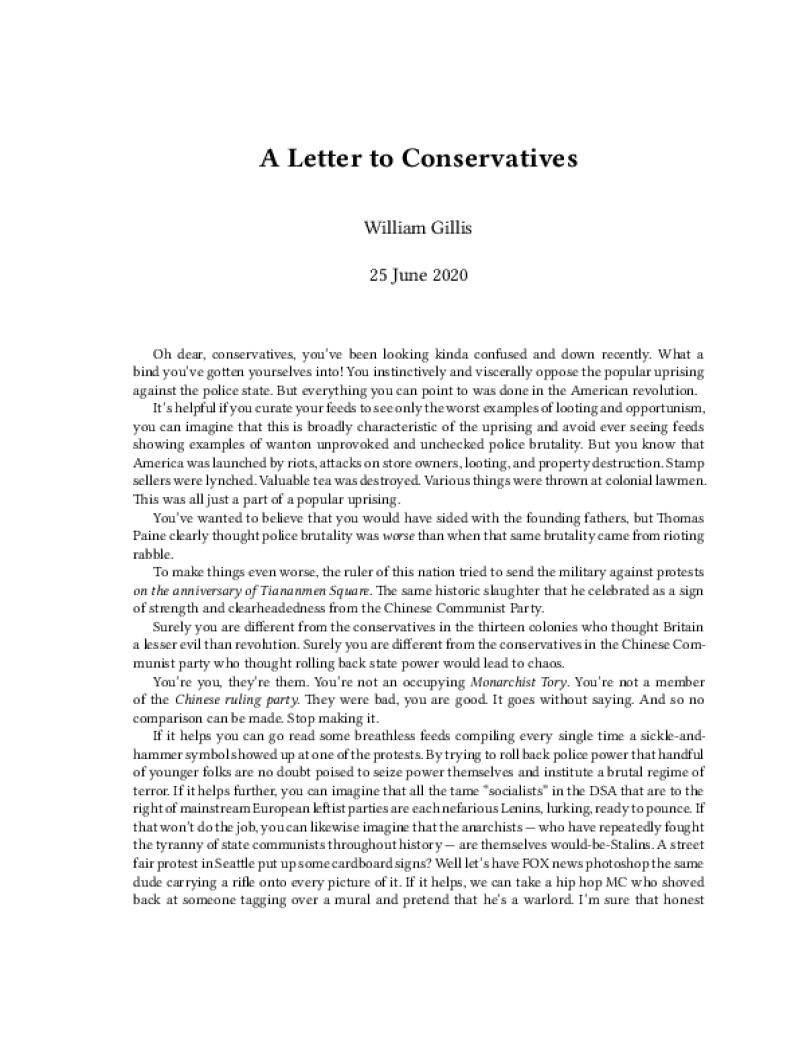 Zine A Letter to Conservatives Author: William GillisPublished: 25 June 2020Language: enCatalog: The Anarchist Library6 pages. Read online: html • pdf •imposed pdf • a4 pdf • epub • muse • tex Share: We mail all zines to incarcerated people for free.