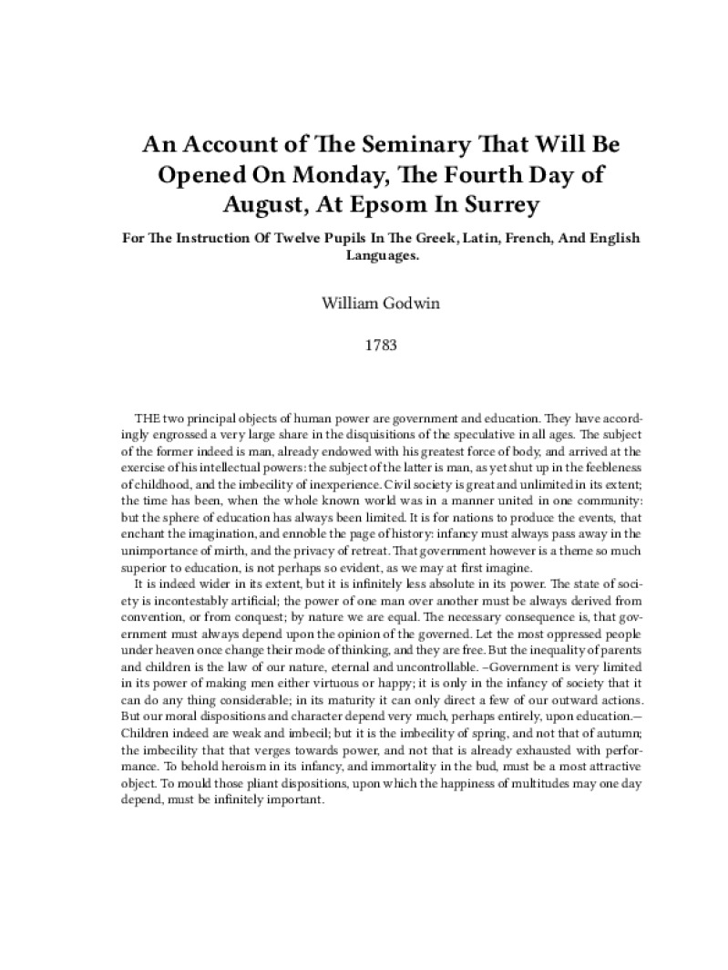 Zine An Account of The Seminary That Will Be Opened On Monday, The Fourth Day of August, At Epsom In Surrey Author: William GodwinPublished: 1783Language: enCatalog: The Anarchist Library14 pages. Read online: html • pdf •imposed pdf • a4 pdf • epub • muse • tex Share: We mail all zines to incarcerated people for free.