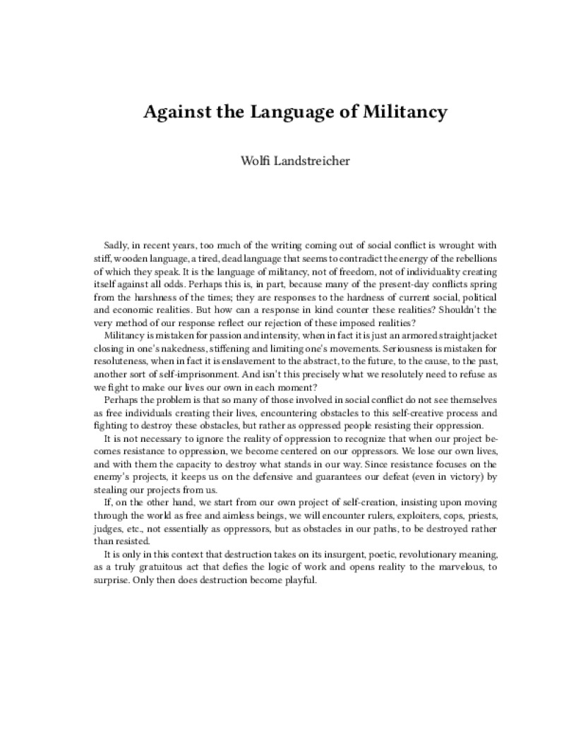 Zine Against the Language of Militancy Author: Wolfi LandstreicherLanguage: enCatalog: The Anarchist Library2 pages. Read online: html • pdf •imposed pdf • a4 pdf • epub • muse • tex Share: We mail all zines to incarcerated people for free.