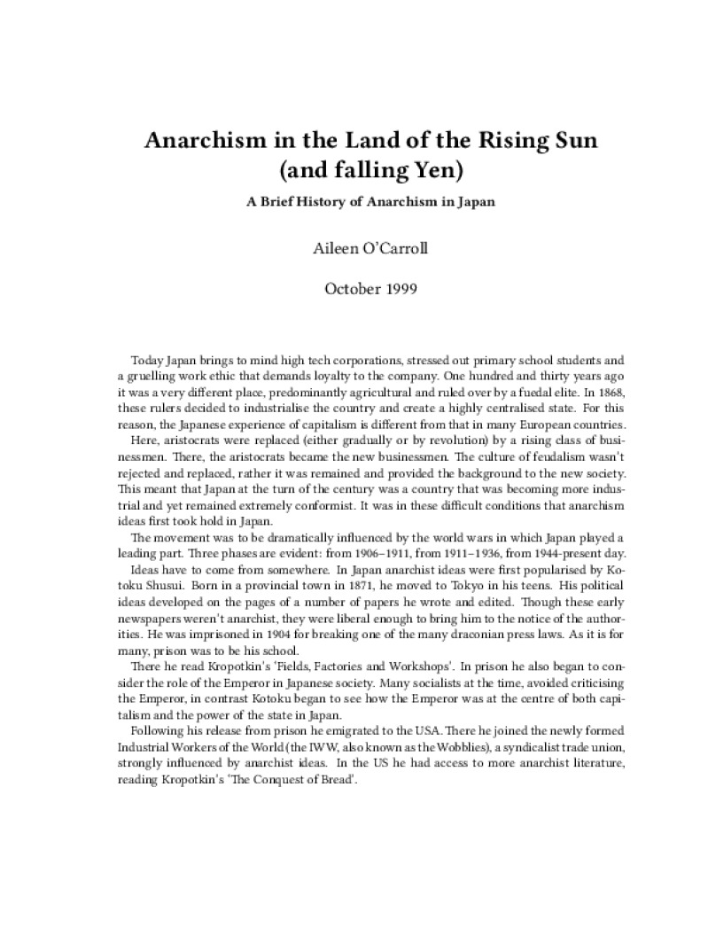 Zine Anarchism in the Land of the Rising Sun (and falling Yen) Author: Aileen O'CarrollPublished: October 1999Language: enCatalog: The Anarchist Library4 pages. Read online: html • pdf •imposed pdf • a4 pdf • epub • muse • tex Share: We mail all zines to incarcerated people for free.