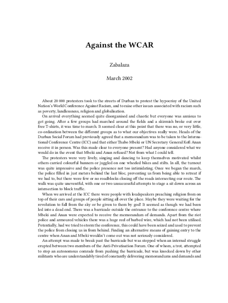 Zine Against the WCAR Author: ZabalazaPublished: March 2002Language: enCatalog: The Anarchist Library3 pages. Read online: html • pdf •imposed pdf • a4 pdf • epub • muse • tex Share: We mail all zines to incarcerated people for free.