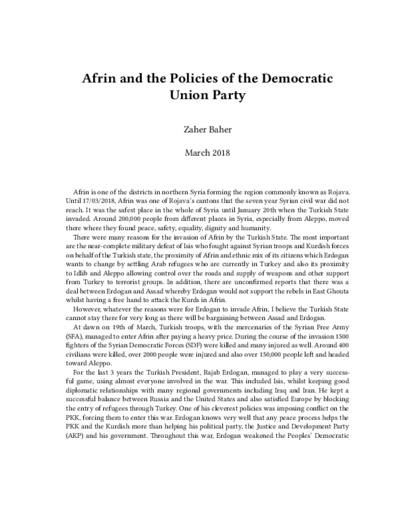 Zine Afrin and the Policies of the Democratic Union Party Author: Zaher BaherPublished: March 2018Language: enCatalog: The Anarchist Library6 pages. Read online: html • pdf •imposed pdf • a4 pdf • epub • muse • tex Share: We mail all zines to incarcerated people for free.