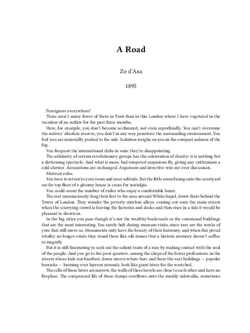 Zine A Road Author: Zo d’AxaPublished: 1895Language: enCatalog: The Anarchist Library6 pages. Read online: html • pdf •imposed pdf • a4 pdf • epub • muse • tex Share: We mail all zines to incarcerated people for free.