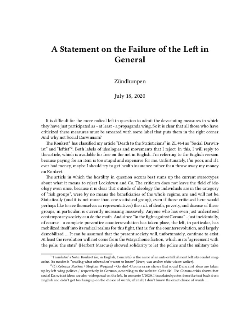 Zine A Statement on the Failure of the Left in General Author: ZündlumpenPublished: July 18, 2020Language: enCatalog: The Anarchist Library3 pages. Read online: html • pdf •imposed pdf • a4 pdf • epub • muse • tex Share: We mail all zines to incarcerated people for free.